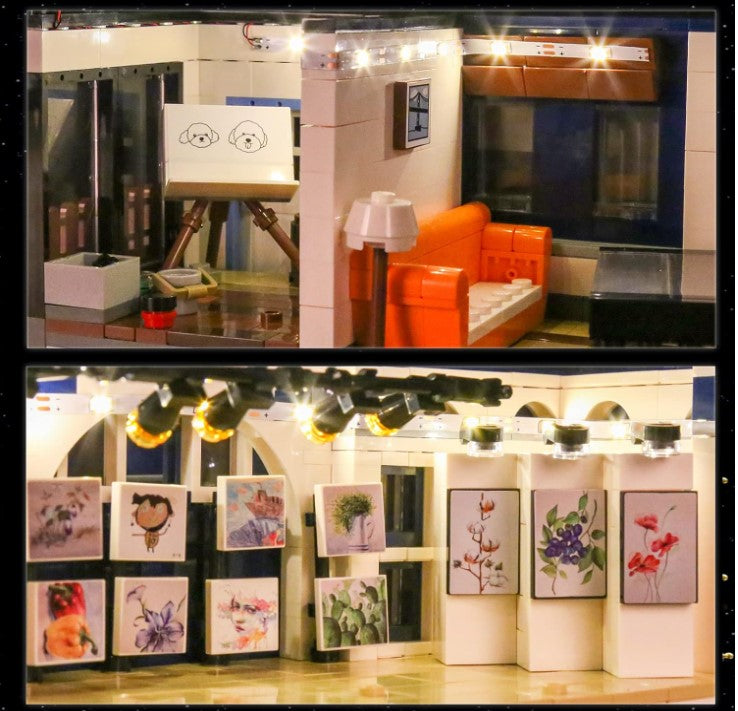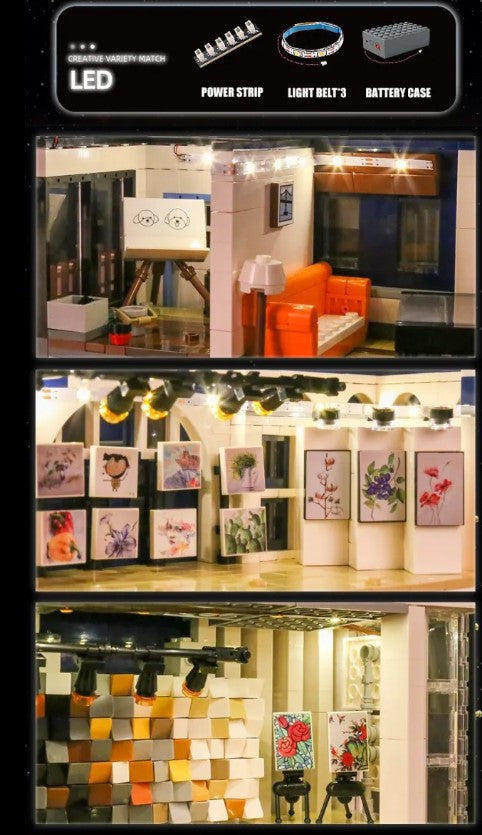 Additional details include a storage room for art supplies, a miniature artist’s workspace, and realistic décor elements. The included LED lighting system with light strips, power hub, and battery box illuminates the gallery for a true nighttime display effect.