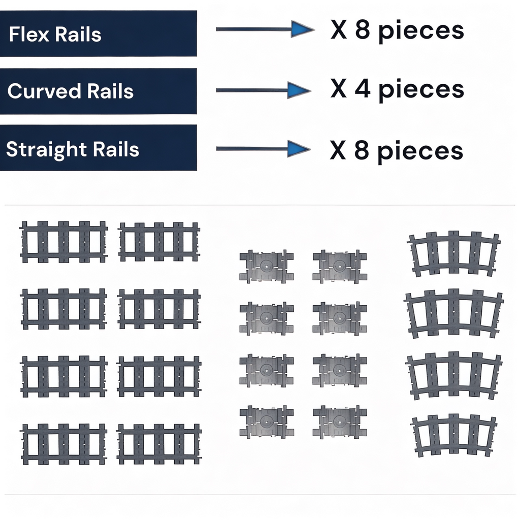 Expand your railway system and add more variety to your train layouts with this 20-piece track expansion set. Featuring a balanced mix of 4 curved tracks, 8 straight tracks, and 8 flex tracks, this set gives you the freedom to design custom routes, create smooth turns, and enhance your railway builds with ease.
