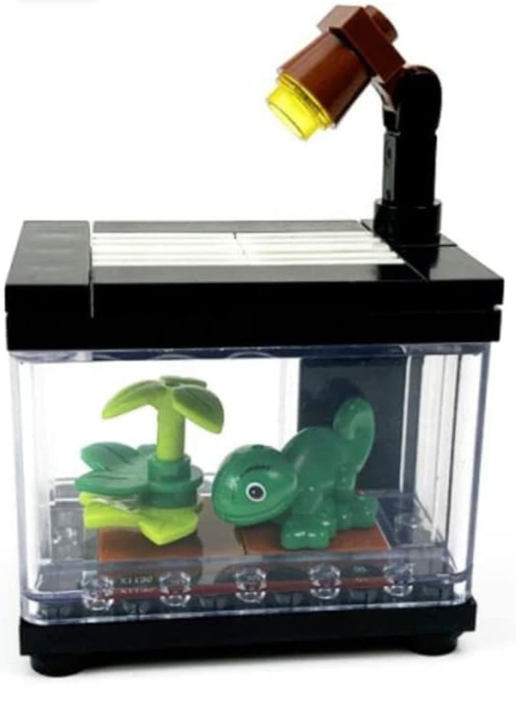 Aquarium with fish and a chameleon terrarium under a heat lamp