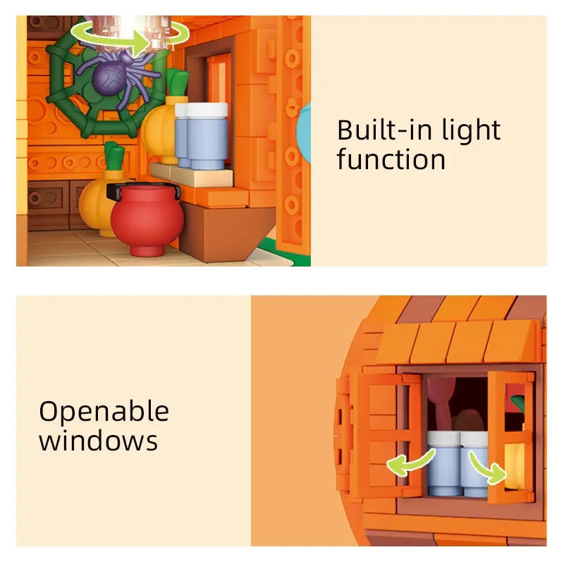 The build includes functional doors and windows, a fully designed interior, and a lighting component that reveals a glowing pumpkin face—making this a charming seasonal display or an imaginative playset for trick-or-treat roleplay.