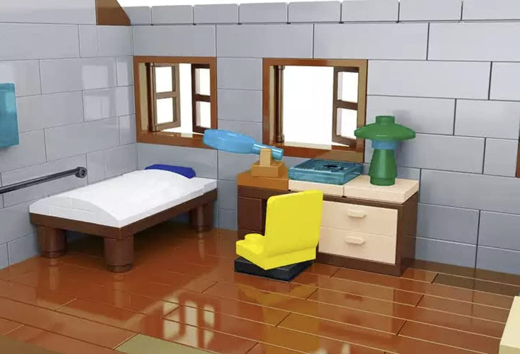 Living quarters upstairs including a bed, desk, chair, lamp, telescope, and more for added character