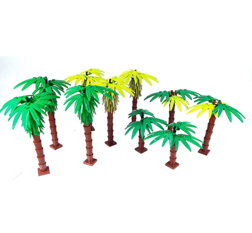 This Accessory Tree is a set of 10 trees in 3 different sizes, light and dark green colors. Use the palms to make your city into a balmy beach town, add them to our beach plates for a complete beach scene, you can even add them to our Jurrasic period set.
