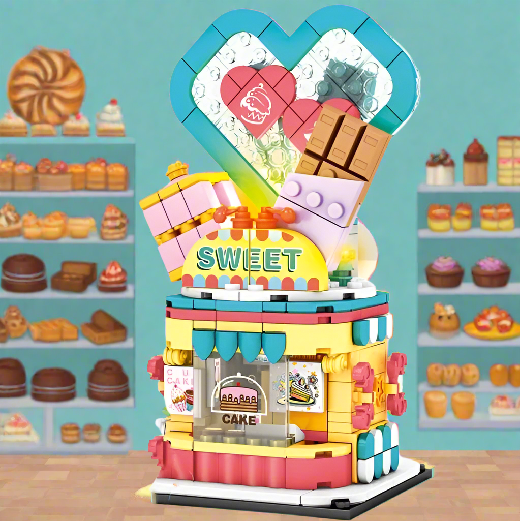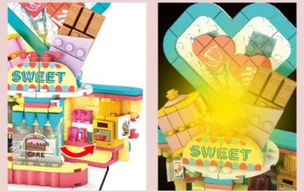 Designed for hands-on creativity, this shop includes working doors, an opening front window, and playful signage — all topped by a giant candy and heart motif to sweeten the scene. Whether added to a city layout or used as a stand-alone piece, it offers hours of building and pretend-play fun.
