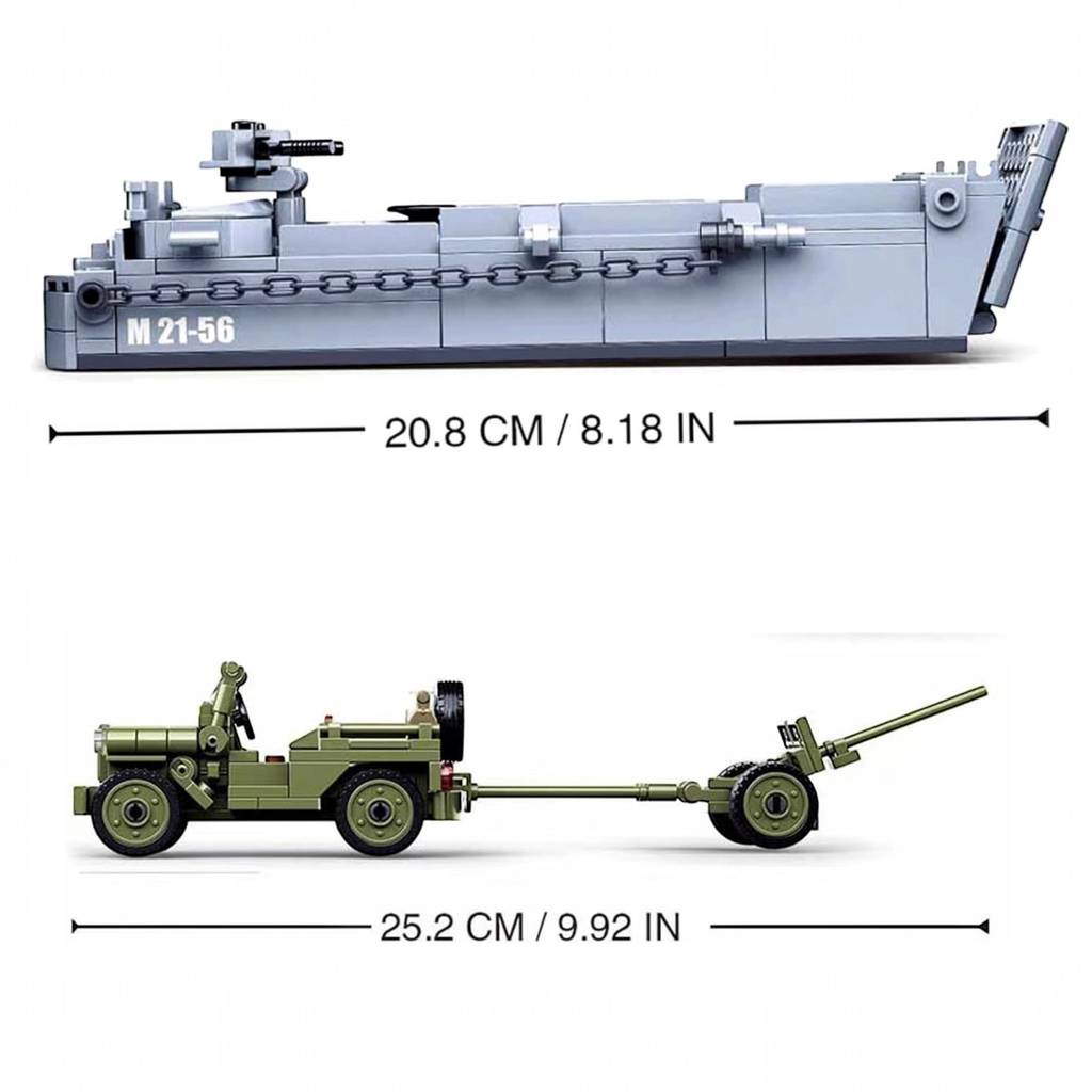 Authentic WWII Vehicles – Includes landing craft (8.18 in) and jeep (9.92 in) with towable gear.