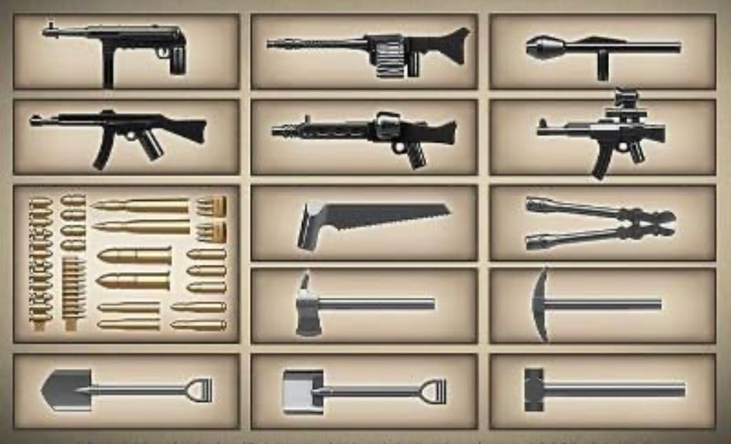 Detailed engine deck and accessories, including tools, weapons, and ammo pieces
